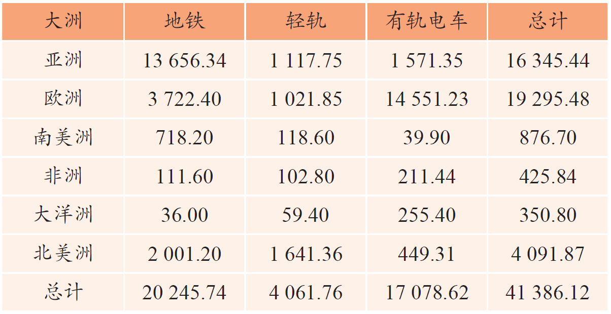 Şəkil 1, dünyanın əsas qitələri boyunca şəhər dəmiryol tranzitinin ümumi miqyasını göstərir (Qeyd: Rusiyanın bütün şəhərləri hesablama üçün Avropaya təsnif edilir). Məlumatlar metro və tramvayların qlobal miqyasda şəhər dəmir yolu tranzitinin əsas növləri və qlobal şəhər dəmir yolu tranziti əsasən Avrasiyada, əsasən Asiya ölkələrində yayılmış metrlərlə cəmləşmişdir. [1]