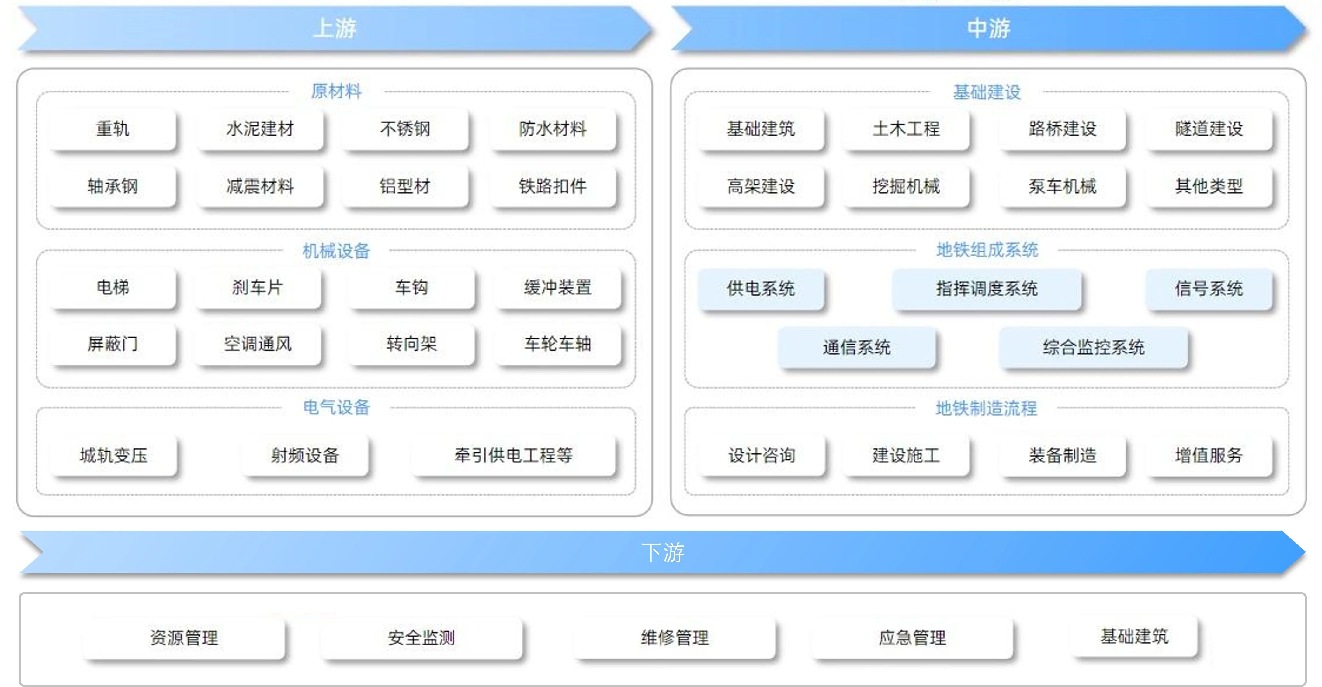 Dəmiryolu tranzit şəhər sənayesini birləşdirir, sənaye zəncirinin uzadılmasını təşviq edir və avadanlıq istehsalı və texnoloji araşdırma və texnoloji arayış kimi dəstəkləyən sahələrin sürətli inkişafını idarə edir. Metro sənayesi zənciri Şəkil 3-də, bütün bağlantılar bir-birindən asılıdır və şəhər aqlomerasiya və metropoliten sahələrinin iqtisadi inkişafını idarə edir. [2]
