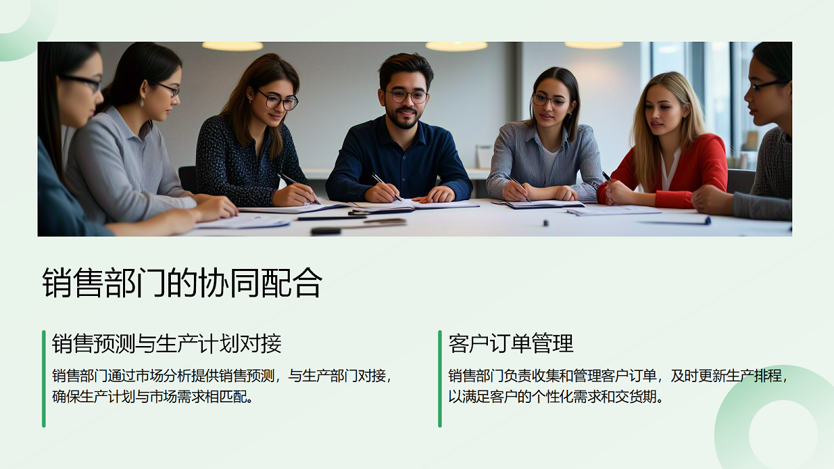 Balanslı istehsal planlamasının həyata keçirilməsi Satış, Mühəndislik, Təchizat Zəncirinin İdarəetmə, Satınalma, İstehsal və Logistika kimi şöbələrin əməkdaşlıq əməkdaşlığından ayrılmazdır. Bu əməkdaşlıq sürətli cavabın əsas məntiqidir və sürətli reaksiya əsas nüvəsi, məlumat rəy və rabitə, həmçinin PDCA (Plan-Do-Yoxlama Qanunu) dövrünün davamlı dərinliyindədir.