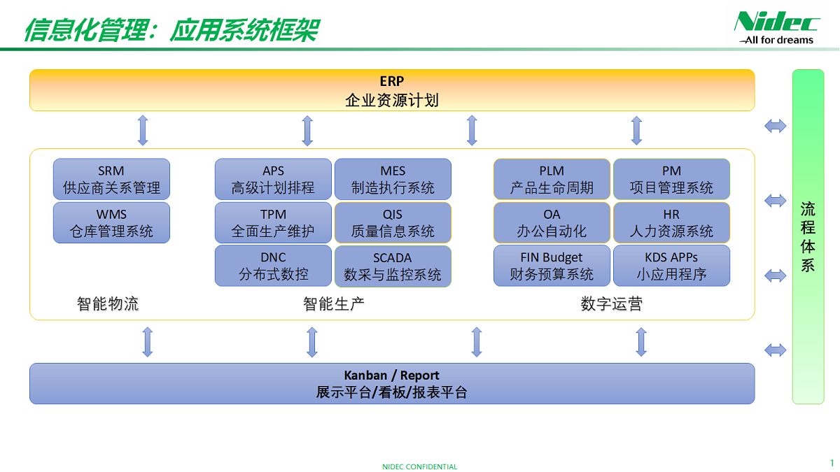 Nidec Lift Motors, SRM (Təchizatçı Münasibətləri İdarəetmə), APS (Qabaqcıl Planlaşdırma və Planlaşdırma Sistemi), WMS (Anbar İdarəetmə Sistemi) və TPM (ümumi məhsuldar baxım) kimi müstəqil şəkildə hazırlanmış sistemlər var. Bütün ağıllı istehsal sistemini avtomatlaşdırma, rəqəmsallaşdırma, modelləşdirmə, vizuallaşdırma, inteqrasiya və zəka vasitəsilə inkişaf etdirir, balanslı istehsal planlaşdırma və çevik ağıllı istehsalın reallaşdırılmasına və "mayak fabrikinin" həyata keçirilməsi üçün möhkəm bir təməl qoymaqla inşa edir.