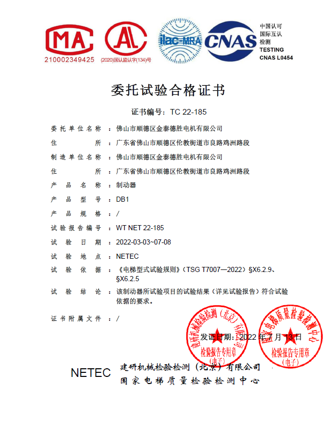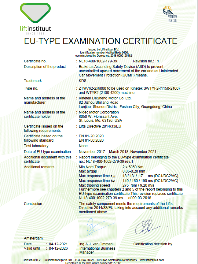 Nidec Elevator Motors, daxili xüsusi avadanlıq tip test sertifikatları və müvafiq xarici məhsul sertifikatları daxil olmaqla, müştərilərin müxtəlif bazar ehtiyaclarını tam cavablandıra biləcək tam və hərtərəfli məhsul sertifikatlarına malikdir.